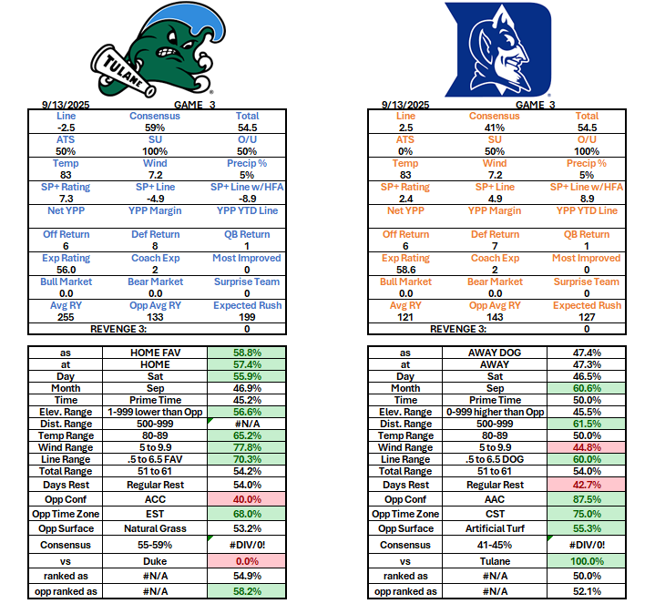 BettingCollege FootballSports mitch's pick: Tulane more picks from Mitch... College Football Week 3 Tulane (-1.5) vs Duke – 9/13/2025 Wyoming (+23.5) vs Utah – 9/13/2025 Tulsa (+13.5) vs Navy – 9/13/2025 South Carolina (-5.5) vs Vanderbilt – 9/13/2025 Georgia Southern (-3.5) vs. Jacksonville State – 9/13/2025 Illinois (-27.5) vs Western Michigan – 9/13/2025 Florida International (-2.5) vs Florida Atlantic – 9/13/2025 North Texas (-5.5) vs Washington State – 9/13/2025 Connecticut (-10.5) at Delaware – 9/13/2025 Memphis (-5.5) at Troy – 9/13/2025 College Football Week 1 San Jose State – Central Michigan 8/30/2025 Georgia Southern – Fresno State 8/30/2025 UCLA – Utah 8/30/2025 North Carolina – TCU 9/1/2025 Florida State – Alabama 8/30/2025 La. Lafayette – Rice 8/30/2025 Colorado – Georgia Tech 8/30/2025 South Carolina – Virginia Tech 8/23/2025 Michigan – New Mexico 8/30/2025 Tulane – Northwestern 8/30/2025 Season Standings Hawaii – Stanford 8/23/2025 Western Kentucky – Sam Houston State 8-23-2025 Fresno State – Kansas 8/23/2025 Iowa State – Kansas State 8/23/2025 Tulane (-1.5) vs Duke – 9/13/2025 game preview Previous articleWyoming (+23.5) vs Utah – 9/13/2025Next articleCollege Football Week 3 LEAVE A REPLY Cancel reply Comment: Please enter your comment! Name:* Please enter your name here Email:* You have entered an incorrect email address! Please enter your email address here Website: Save my name, email, and website in this browser for the next time I comment. Tulane (-1.5) vs Duke - 9/13/2025