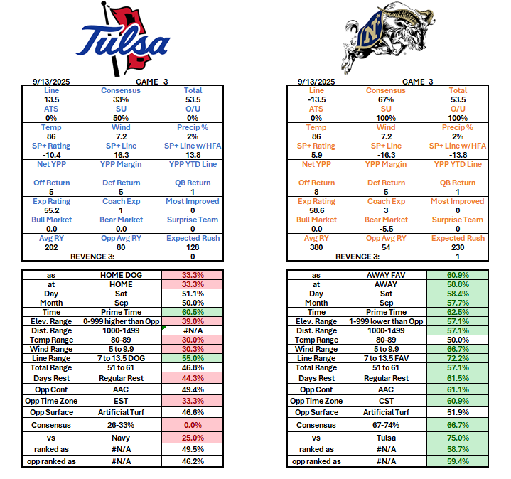 BettingCollege FootballSports mitch's pick: Navy more picks from Mitch... College Football Week 3 Tulane (-1.5) vs Duke – 9/13/2025 Wyoming (+23.5) vs Utah – 9/13/2025 Tulsa (+13.5) vs Navy – 9/13/2025 South Carolina (-5.5) vs Vanderbilt – 9/13/2025 Georgia Southern (-3.5) vs. Jacksonville State – 9/13/2025 Illinois (-27.5) vs Western Michigan – 9/13/2025 Florida International (-2.5) vs Florida Atlantic – 9/13/2025 North Texas (-5.5) vs Washington State – 9/13/2025 Connecticut (-10.5) at Delaware – 9/13/2025 Memphis (-5.5) at Troy – 9/13/2025 College Football Week 1 San Jose State – Central Michigan 8/30/2025 Georgia Southern – Fresno State 8/30/2025 UCLA – Utah 8/30/2025 North Carolina – TCU 9/1/2025 Florida State – Alabama 8/30/2025 La. Lafayette – Rice 8/30/2025 Colorado – Georgia Tech 8/30/2025 South Carolina – Virginia Tech 8/23/2025 Michigan – New Mexico 8/30/2025 Tulane – Northwestern 8/30/2025 Season Standings Hawaii – Stanford 8/23/2025 Western Kentucky – Sam Houston State 8-23-2025 Fresno State – Kansas 8/23/2025 Iowa State – Kansas State 8/23/2025 Tulsa (+13.5) vs Navy – 9/13/2025 game preview Previous articleSouth Carolina (-5.5) vs Vanderbilt – 9/13/2025Next articleWyoming (+23.5) vs Utah – 9/13/2025 LEAVE A REPLY Cancel reply Comment: Please enter your comment! Name:* Please enter your name here Email:* You have entered an incorrect email address! Please enter your email address here Website: Save my name, email, and website in this browser for the next time I comment. Tulsa (+13.5) vs Navy - 9/13/2025