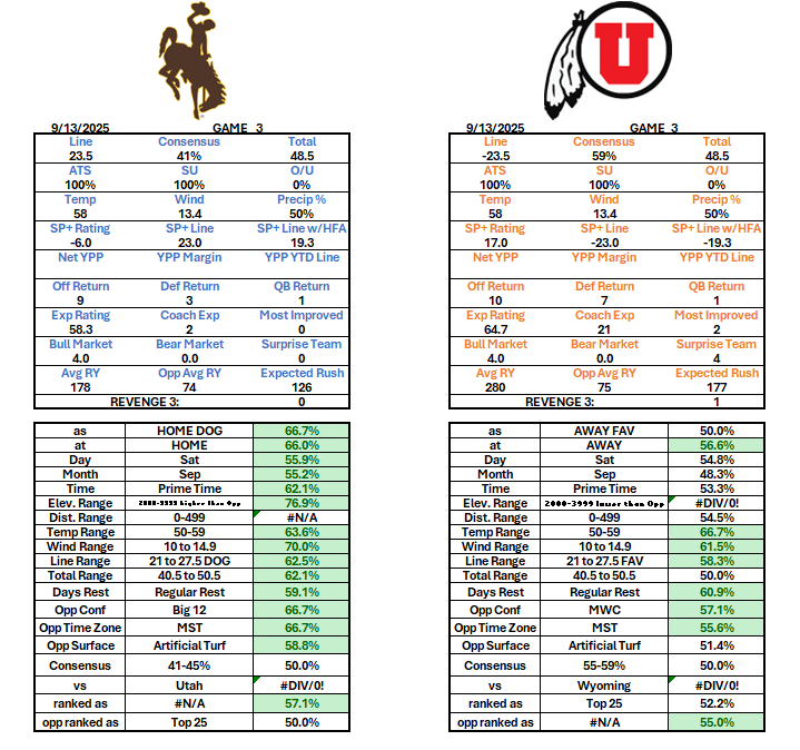 BettingCollege FootballSports mitch's pick: Wyoming more picks from Mitch... College Football Week 3 Tulane (-1.5) vs Duke – 9/13/2025 Wyoming (+23.5) vs Utah – 9/13/2025 Tulsa (+13.5) vs Navy – 9/13/2025 South Carolina (-5.5) vs Vanderbilt – 9/13/2025 Georgia Southern (-3.5) vs. Jacksonville State – 9/13/2025 Illinois (-27.5) vs Western Michigan – 9/13/2025 Florida International (-2.5) vs Florida Atlantic – 9/13/2025 North Texas (-5.5) vs Washington State – 9/13/2025 Connecticut (-10.5) at Delaware – 9/13/2025 Memphis (-5.5) at Troy – 9/13/2025 College Football Week 1 San Jose State – Central Michigan 8/30/2025 Georgia Southern – Fresno State 8/30/2025 UCLA – Utah 8/30/2025 North Carolina – TCU 9/1/2025 Florida State – Alabama 8/30/2025 La. Lafayette – Rice 8/30/2025 Colorado – Georgia Tech 8/30/2025 South Carolina – Virginia Tech 8/23/2025 Michigan – New Mexico 8/30/2025 Tulane – Northwestern 8/30/2025 Season Standings Hawaii – Stanford 8/23/2025 Western Kentucky – Sam Houston State 8-23-2025 Fresno State – Kansas 8/23/2025 Iowa State – Kansas State 8/23/2025 Wyoming (+23.5) vs Utah – 9/13/2025 game preview Previous articleTulsa (+13.5) vs Navy – 9/13/2025Next articleTulane (-1.5) vs Duke – 9/13/2025 LEAVE A REPLY Cancel reply Comment: Please enter your comment! Name:* Please enter your name here Email:* You have entered an incorrect email address! Please enter your email address here Website: Save my name, email, and website in this browser for the next time I comment. Wyoming (+23.5) vs Utah - 9/13/2025